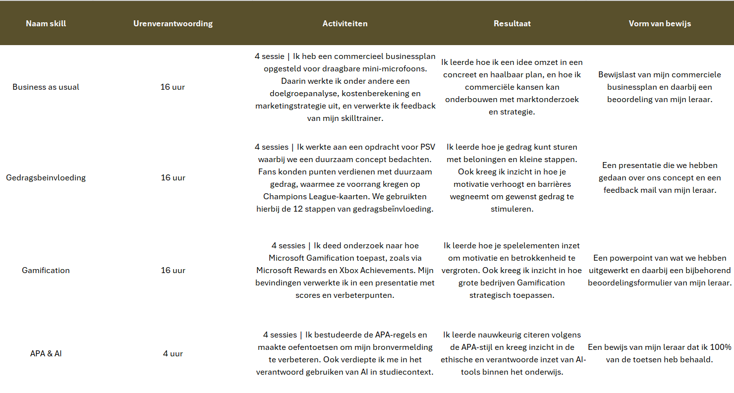 In het afgelopen half jaar heb ik alle skills binnen DMS doorlopen en toegepast in verschillende opdrachten en casussen. Dit heeft me geholpen om mijn kennis en vaardigheden verder te ontwikkelen. Per skill heb ik beschreven waarom ik voor de skill heb gekozen, hoe ik ermee aan de slag ben gegaan en welke inzichten ik heb opgedaan. Daarnaast heb ik gereflecteerd op wat ik nou precies heb geleerd en heb ik natuurlijk bewijslast toegevoegd